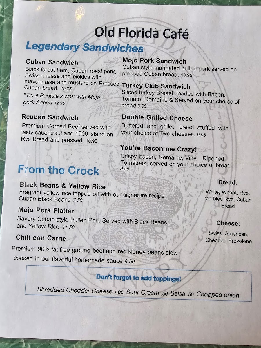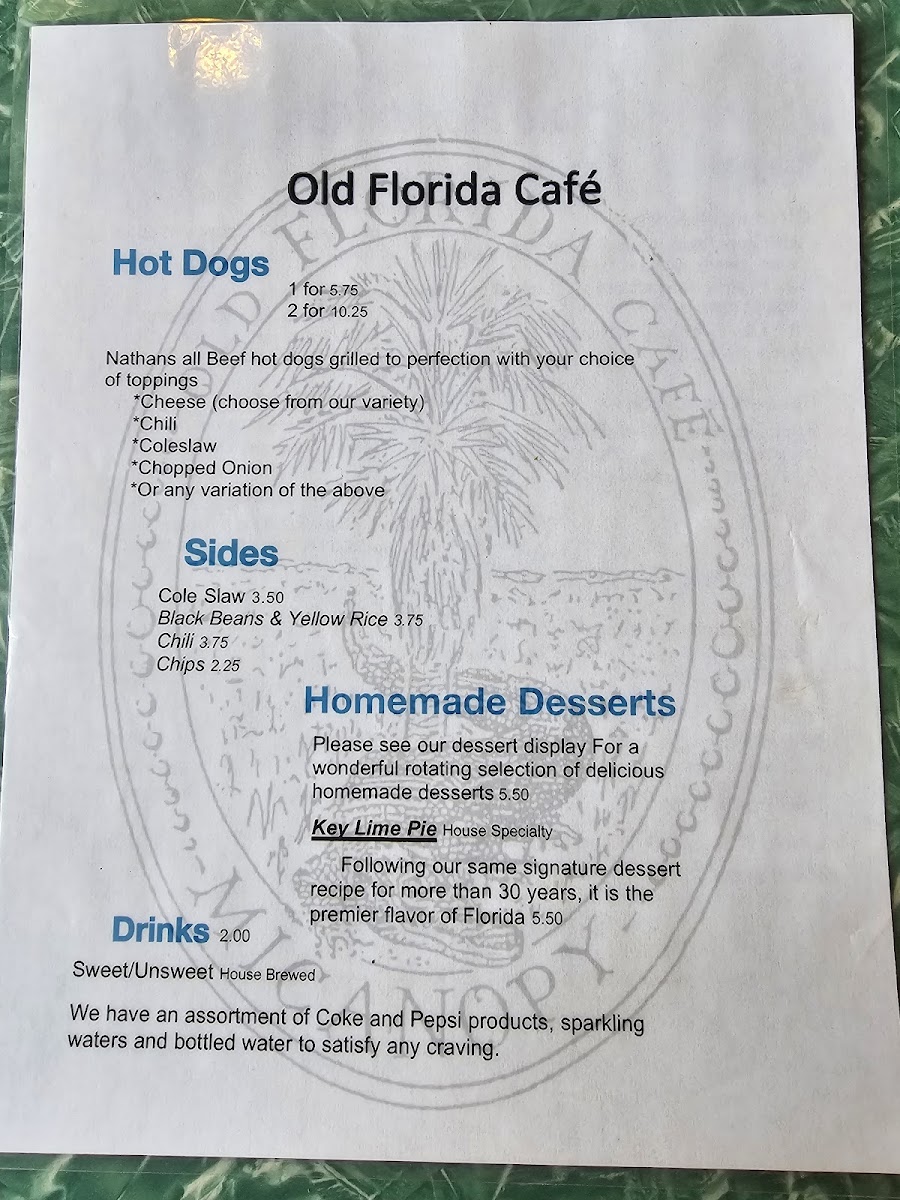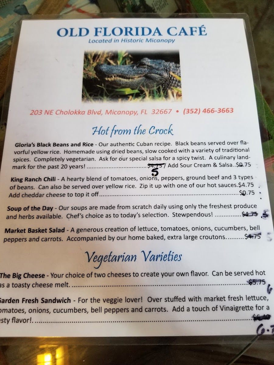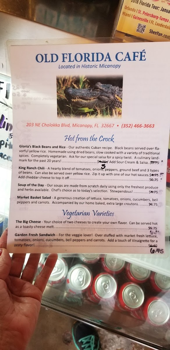 Welcome to the Old Florida Cafe, where we invite you to savor a delightful array of home-cooked flavors that reflect the charm of our local community. Situated at 203 NE Cholokka Blvd in picturesque Micanopy, our menu boasts a tempting selection of specialties, from rich coffees and velvety Café Con Leche to our beloved Chicken Salad Sandwich and classic BLT. Don’t miss our must-try desserts like the decadent Chocolate Cake and the luscious Hazelnut Pie. With homey touches like Beans over Yellow Rice and the hearty Reuben Sandwich, every dish is made with love and fresh ingredients. Join us for a truly memorable meal, and let your taste buds experience the best of Old Florida!